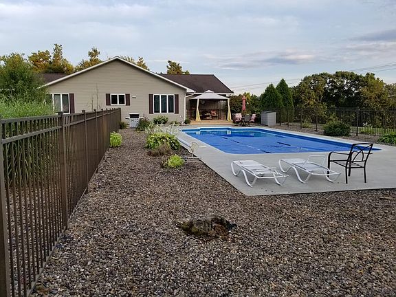 Situated on a level 4 acre lot, not far from town, is this contemporary, ranch-style home with in-ground pool. The open floor plan consists of a living room with fireplace, fully-equipped kitchen, dining area and family room. There are 4 bedrooms and 2.5 baths and the master suite features a walk-in closet, air conditioning and a master bath with separate shower and tub. The lower level has a game room with fireplace, a hobby room and a half bath. The home has a hot water heating system and is serviced with public sewer and public water in the near future. The 2 car attached garage provides convenience and the 4 car detached garage provides additional storage. The driveway is paved and there is an abundance of parking area.