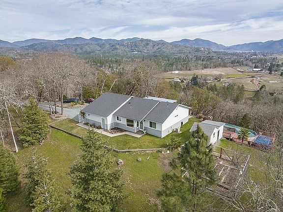 Discover a slice of paradise at 181 Azalea Drive! This countryside retreat, nestled on 5 acres, offers breathtaking views of the valley, farms, town, and the serene Rogue River. The freshly painted exterior and new carpet make it move-in ready. A new heating/air system ensures year-round comfort. The wood stove adds warmth and charm to the interior. With 1,492 sq ft, there's room to spread out and enjoy the peaceful surroundings. Step outside to your private oasis with a sparkling pool, perfect for hot summer days and entertaining. Don't miss this unique opportunity for serenity and luxury.