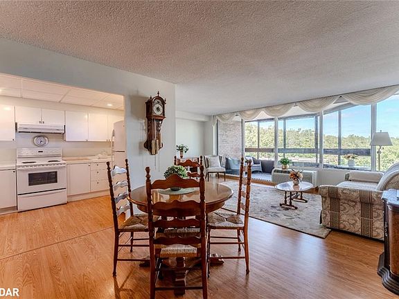 HIGHLY REGARDED BAY CLUB CONDO STEPS FROM KEMPENFELT BAY WITH UNBEATABLE AMENITIES, A STRONG COMMUNITY, & STUNNING SUNROOM WITH WATER VIEWS! Discover 1,210 square feet of bright, carefree living in this expansive condo located in the highly sought-after Bay Club, just steps to Kempenfelt Bay, scenic waterfront trails, and shoreline parks with playgrounds and open green space overlooking the water. Enjoy a truly walkable lifestyle with downtown shops, restaurants, cafes, cultural venues, and entertainment all within minutes, plus easy access to public transit routes connecting you throughout Barrie. This well-established residence is celebrated for its reputable management and strong sense of community, with secure entry and beautifully landscaped grounds enhancing the appeal. Oversized windows flood the immaculately maintained open concept living, dining, and kitchen area with natural light, while the enclosed sunroom extends the living space year-round with spectacular southeast views of the bay. This unit is also the only 2-bedroom floor plan in the building without a step down, providing ease and functionality. The spacious primary retreat offers a private 4-piece ensuite, complemented by a second bedroom and another full 4-piece bathroom, while an in-suite laundry room with storage adds everyday convenience. Exceptional resort-style amenities elevate your lifestyle, including an indoor pool, sauna, gym, racket and squash court, tennis court, library, party and games rooms, guest suites, workshop, potting room, car wash bay, bike storage, and ample underground and visitor parking. Step into a community that delivers more than just a #HomeToStay, and discover effortless condo living with every comfort and convenience right at your doorstep.