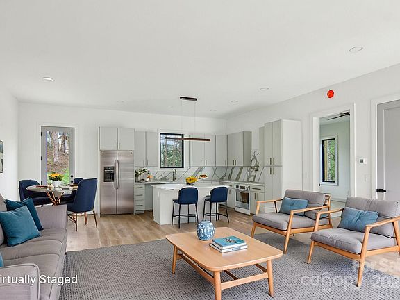 Stunning New Scandinavian-Style Modern Home in Canton, NC. This New build features 4 bed and 3.5-bath blending sleek modern design with cozy charm. Located at the end of a quiet road in a sought-after neighborhood, it offers 10' ceilings, supreme finishings, 4 expansive decks that capture natural light & scenic views. Eat-in chef’s kitchen is a dream, featuring quartz countertops, high-end appliances, pot filler & custom cabinetry—perfect for cooking and entertaining. The open living area flows seamlessly to outdoor spaces, creating a perfect indoor-outdoor connection. Upstairs, a bonus living area provides extra space, along with a second primary en-suite & a Jack-and-Jill bathroom connecting two bedrooms. Thoughtfully designed with superior siding, stone accents, boulder wall & a creek, this home offers both elegance + tranquility. Situated in a peaceful yet convenient location this exceptional home is a rare opportunity for modern luxury in a natural setting.