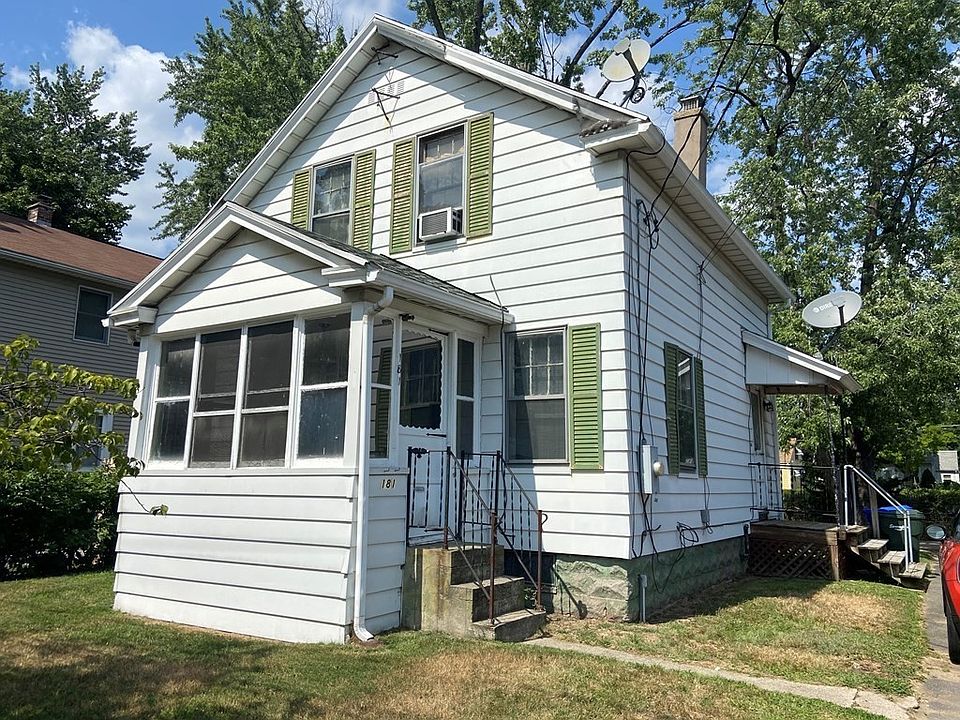 Charming home ready for the next buyer. Solid wood cabinets in the open floor concept kitchen with easy to clean vinyl floors. Carpet in the oversized living room, can be used as a living/dining room combo. Enclosed front porch for relaxing after a long day. The back yard is very large and has a driveway almost all the way back. City sidewalks on this quiet street. Both bedrooms are upstairs with hardwood floors. Plenty of storage in bedroom closets and there is an attic closet at the top of the stairs. The full, unfinished basement has a hatch to the back yard. Older home with great bones, can have a quick closing.
