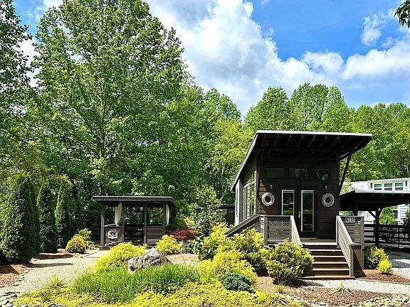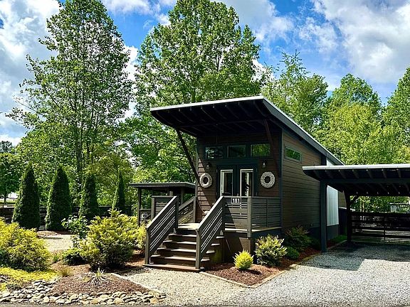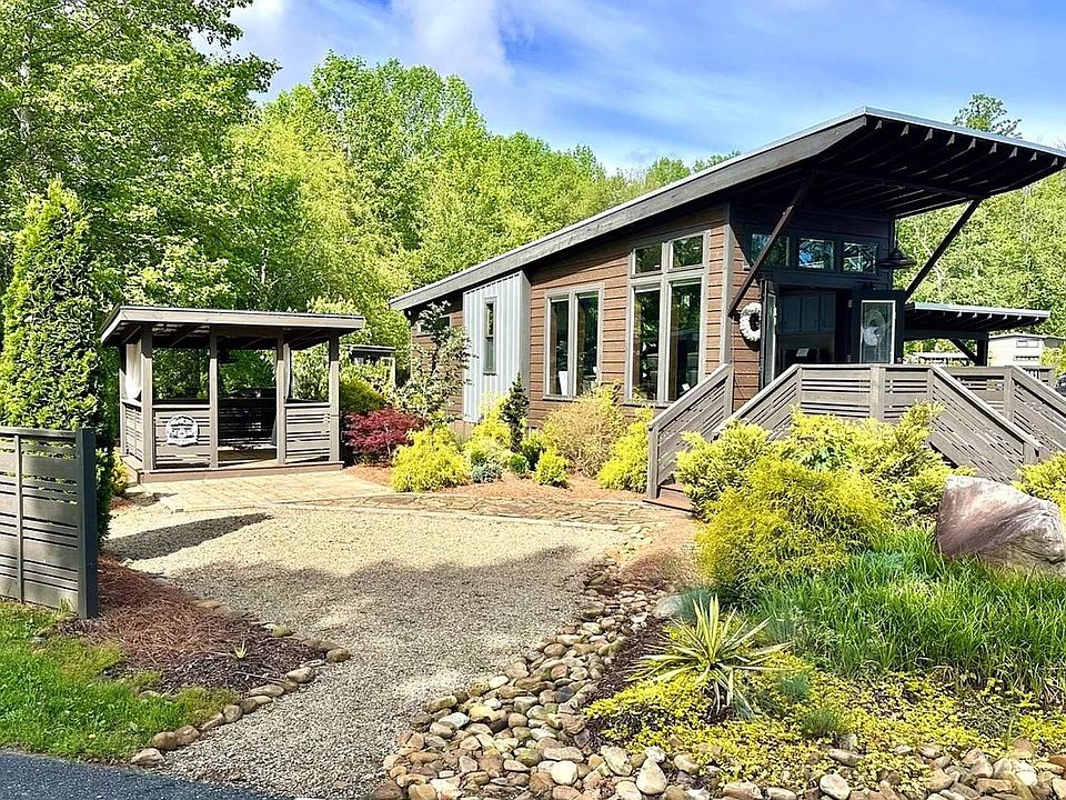 The Wedge House is a 399 square foot Park Model home located in the desirable Villages by Simple Life, a gated community in Flat Rock, NC just five minutes from downtown Hendersonville and thirty minutes to Asheville. This modern home features a carport, shed, covered front porch, large covered cabana, paved patio, fire pit area, a scenic pond view and a landscaped yard designed for both relaxation and entertaining. Inside, the home is being sold fully furnished with powered leather recliners, a dining table with chairs, queen size bed with end tables, Adirondack chairs with fire pit, and all appliances including a full-size stainless side-by-side refrigerator, microwave, dishwasher, washer, and dryer. Custom upgrades add a thoughtful touch, including dimmers on overhead lights, retractable screen French doors, a thick glass shower door, and a tile backsplash with USB outlets. Living in the Villages by Simple Life offers an exceptional retreat lifestyle with lot rent that includes access to two clubhouses, two swimming pools, two fitness centers with showers, gym classes, vegetable and herb gardens, community fire pits, and dog parks. Utilities such as water, cable TV, and twice-weekly trash pickup are also included, along with an active social calendar featuring exercise classes, complimentary food truck dinners, live music evenings, and more. Short term and long term rentals are allowed with management approval. Lot rent for this property is $943 per month and provides exclusive access to all the onsite enjoyment and amenities. This is a remarkable opportunity to establish a full-time residence, enjoy a seasonal retreat, or invest in a lucrative rental property.