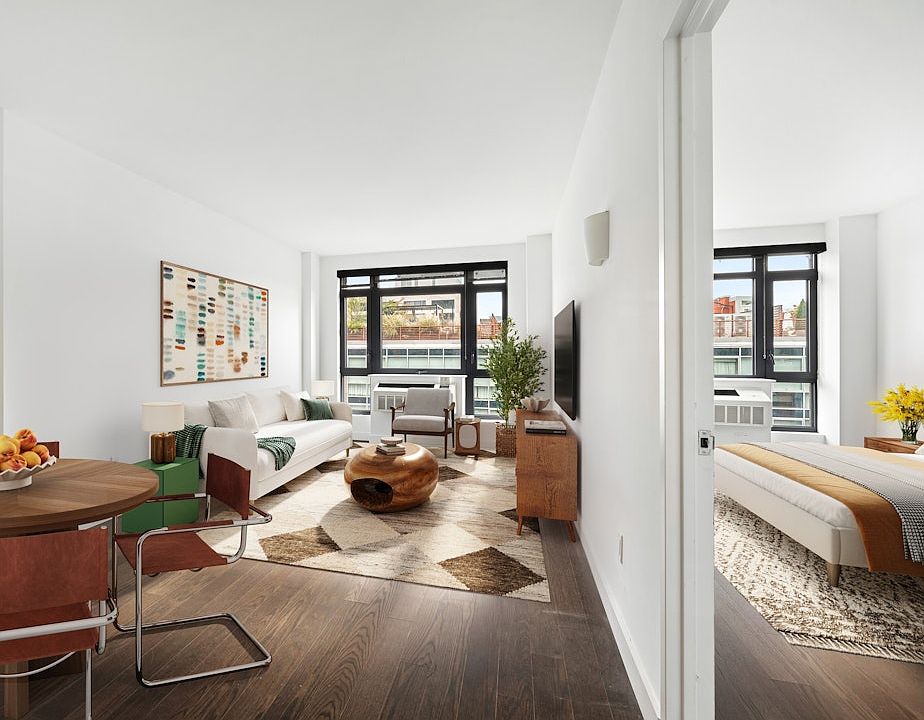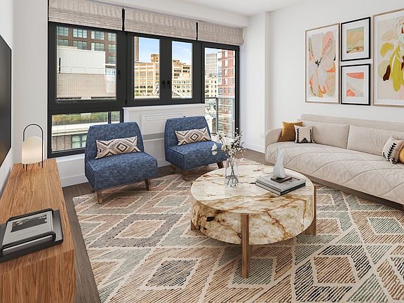 Residents can enjoy exclusive amenities such as a rooftop terrace featuring panoramic views of Manhattan and the East River. Additional amenities include a 24-hour attended lobby, on-site parking, a fitness center, a children's playroom, and bicycle and stroller storage. It is conveniently located just one block from the F train.