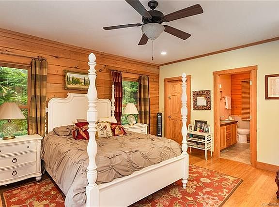 Beautiful Cyprus log home with master bedrooms on two levels. Bamboo hardwood floors throughout main living areas. Great room features gas fireplace, a wall of windows and doors that open up to a huge deck. Galley style kitchen boasts hickory cabinets and stainless steel appliances. Dining room opens up to back deck. In addition to the master suite, the main floor has an additional bedroom and another that can be used as an office. Multi-use loft currently set us as more sleeping quarters. Down stairs has a second family room and huge master bedroom suite. Outside the home, there are two water features; one off the dining room and one off the downstairs master suite. Additional seating areas outside with one featuring a soaking tub; one featuring an outdoor fireplace and one with a fire pit. Mature, low maintenance landscaping even has banana trees. Lake Lure access across the street. Seasonal views of the lake from the house.