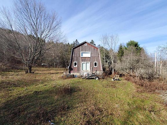 This unique gambrel style cabin with loft, set on 5 pristine acres on a private road, presents an opportunity for those looking for a weekend escape, hunting camp, investment property, or even full time residence. The cabin itself features an open floor plan with kitchen, full bath, one bedroom, and dining/living room space on the main floor, as well as a large open loft space above. It also has a full basement with forced air furnace (not connected currently) for possible extra living space or storage, however, the concrete block foundation has been compromised and is in need of attention. The land is accessed from Hutchinson Lane, a slightly rough private road just a short distance off of Terry Clove Rd, and is bordered on two sides by NYC watershed land (32 acres, not public access). The road divides the parcel, with the eastern segment showcasing classic Catskills rock features and mixed forest growth. The larger western section features a small spring overflow stream, level lawn area, excavated (but not filled) pond site, and stacked stone walls. For those willing to invest some time and equity, the rewards could be an ideal weekend or vacation property. The property is sellin