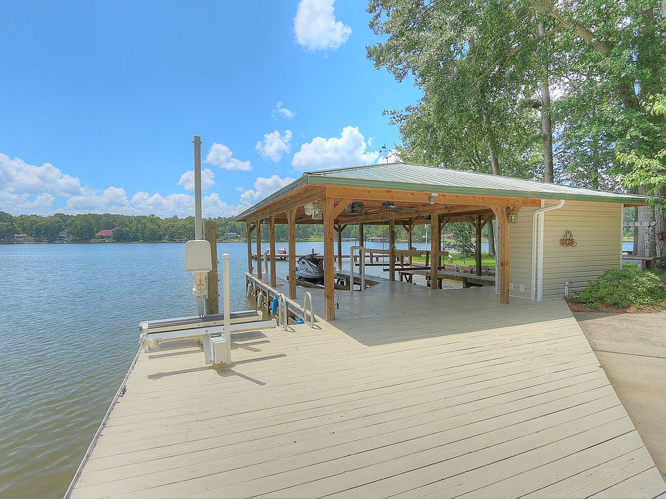 Location, location, location! This 6,000 square foot home is located in one of the most perfect areas on the lake. It's great for guests and entertaining with its expansive parking areas, including a double car garage and car port. The front door leads you into a Great Room with wainscoting, crown molding, and hard wood floors with room for a baby grand, dining, living area with fireplace, and gourmet kitchen with 14 foot island, top of the line appliances with extras such as a trash compactor, drawer microwave, and beverage center. The newly renovated kitchen also features Cambria quartz countertops and custom made cabinets with a uniquely designed display area for your crystal, china, or favorite objet d'art. There is also a considerable amount of extra storage under the sizable window seat. You then move into a sun room with a sweeping view of the lake. There is substantial space for outdoor entertaining via the screened-in room, a large deck with plenty of room for an eight person dining set and sitting area, a fire pit, and dock. The double boat house includes 2 heavy duty hydraulic lifts for your oversized watercraft, 2 jet ski lifts, gentle steps into the water, and blue tooth speakers for enjoyment while in the lake or while playing a game of bocce ball or corn hole on the beautiful Zoysia grass. The She Shed or Office is big enough to relax in with friends while enjoying the lake view or conducting business with its separate entrance. This house has everything you need to welcome visitors with its six bedrooms, four and a half baths, extra kitchen, four tv/entertaining areas, and two fireplaces, not including all of the outdoor living spaces. You will never have to worry about losing power with the whole house automatic generator. The laundry room has a brand new full size washer/dryer along with a separate steamer for wrinkle free living! The entire house has new windows and plantation shutters for that up scale feel.