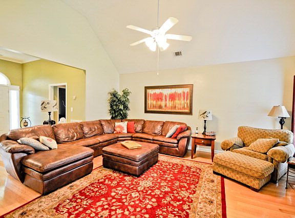 Fantastic open floor plan all brick 4 bedrm 3 bath with detached 16x12 workshop plus attached 2 car side entry garage! Beautiful wood floors, security system w/all windows and doors wired, full sprinkler systems, screened porch, privacy fenced yard, new carpet & more! Features kitchen w/island & new stainless steel appliances that opens up to breakfast rm and sunroom/keeping rm! Living rm with gas fireplace & vaulted ceiling! Dining rm with wainscotting. Owners suite w/vaulted ceiling, double sink vanity, ceramic tile floor, tub and separate shower plus nice walk in closet! Split bedrm plan with both spare bathrooms with ceramic tile floors! Large laundry rm w/ceramic tile floor & room for a spare refrigerator or freezer! All light bulbs inside house are led!