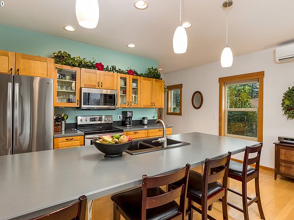 Spectacular spot on NW Spring St! Newer, immaculately kept townhouse in desirable White Salmon neighborhood. Main level Great Room with 9" ceilings, maple hardwood floors and slider leading out to the 10x24' covered deck. Peek view of Mt hood and the river. Kitchen has large island with eating bar, maple shaker style cabinets and stainless appliances. Lower level boast 2 bedrooms each with full baths, one with walk in closet. Both have sliders out to patio with terraced backyard & nice garden.