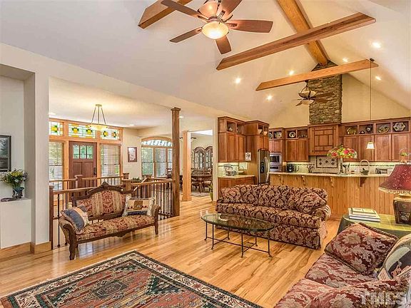 Private waterfront home on 4.8 acres close to Pittsboro amenities. A bird lover's paradise & nature sanctuary: go fishing or kayaking on the Rocky River. Lots of river frontage with a lovely shaded meadow. Gardens & fruit trees. A spacious home w/ cherry cabinets, hickory floors, stainless appliances, beamed ceilings, stained glass & granite throughout. His/hers master walk-in closets. Elegant tile & artful stone work make for one of a kind home. Enjoy views of the Rocky River while you eat!