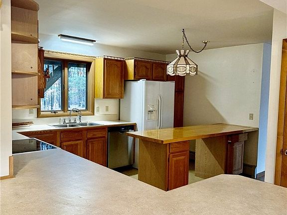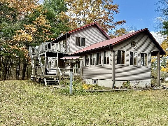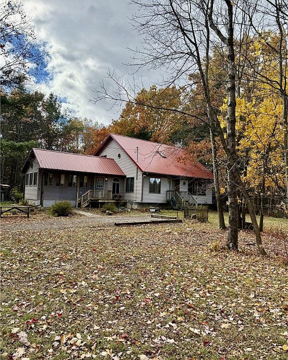 Inviting and Charming bright spacious contemporary amongst the trees on 10 plus acres mostly wooded acres with many extras.  Home features three bedroom 2 full baths,striking sunroom with hardwood floors, french doors, large windows and a full walkout basement.  Brand new metal roof, brand new hot water heater, hot water baseboard heat and a generator hook up. Large one and a half story Workshop which was the original home back in the day has electricity and a furnace.  Giant frog pond, walking trails and many outdoor shed/shelters for storage.  Being offered "AS IS."  A real gem for those with vision.