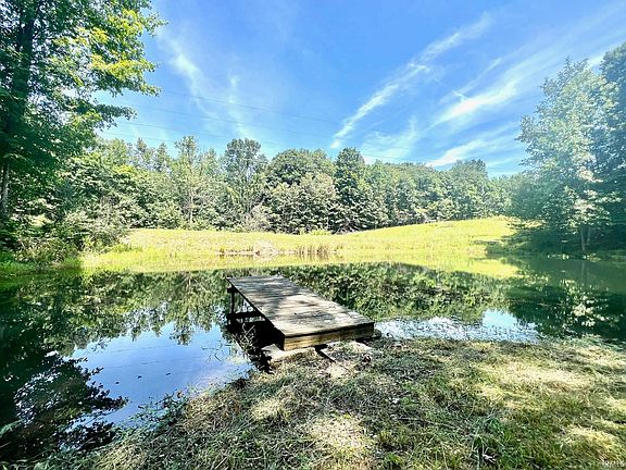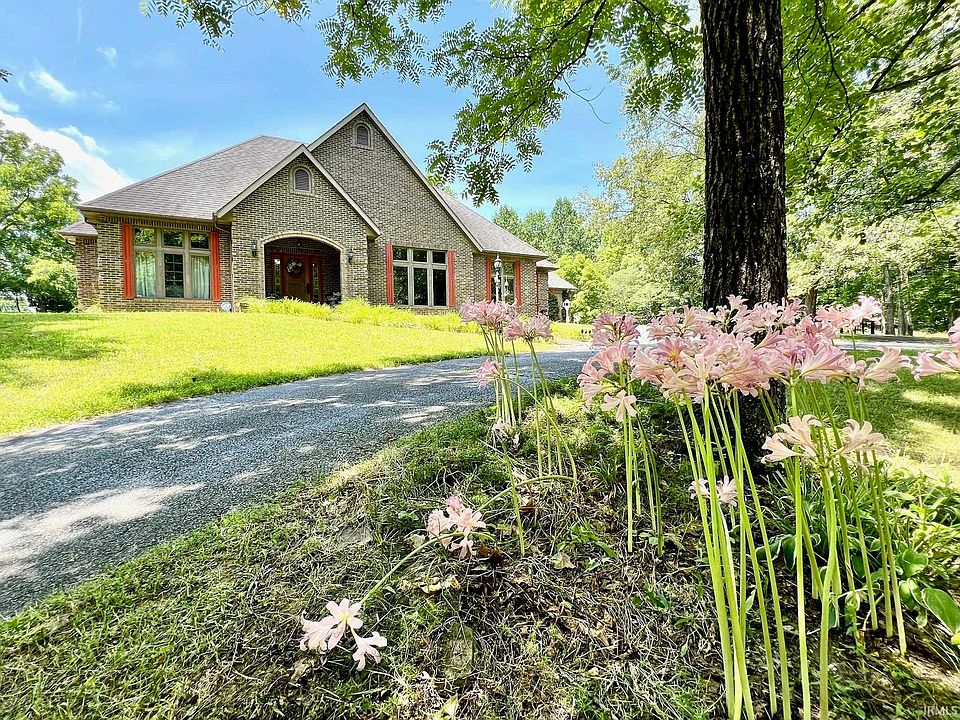 Exquisite one-of-a-kind estate, set on just under 25 serene acres down a long private drive with 2 beautiful homes, 1/4 mile off US HWY 50E. The centerpiece is a stunning brick home offering 2,726 square feet, with 2 beds (possibility of a 3rd & 4th beds in fin. workshop or bsmt), 2.5 baths, soaring 10-foot ceilings, and floor-to-ceiling windows in the living room that offers breathtaking views of the picturesque stocked pond, plus a partial unfinished poured concrete basement. The property also includes a charming 888 SF cottage with 2 bedrooms and 1 bath, ideal for a mother-in-law suite or a possible rental. With ample room for ATV riding, recreational activities such as fishing or hunting, and additional building sites, this property offers endless possibilities. REMC Fiber Internet. Being sold As-Is. Main home is LP heat, tank owned, and secondary home is total electric on separate meter w/ same water meter. Survey available. 5 YR. Updates:New flooring dining/den/front bed, 2 new 3 panel windows, all HVAC srvcd in 2024, leaf gutter filters. About 13 mins to Bedford city limits.