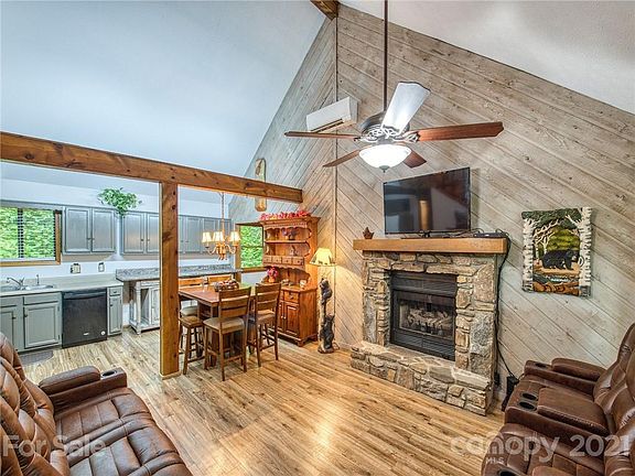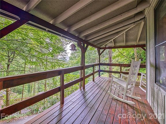 Wake up to hear nearby waterfall while you take sunrise views from the wrap-around porch. Maggie Valley Country club is just down the hill for golfers and swimmers. Upstairs massive Master Suite has a spacious bathroom, ample closet space, living area, and deck to your own private waterfall (rainy day water flow). A comfortable place to stargaze. 2-story great room includes a beautiful stone fireplace, dining area, open floor plan kitchen with lots of counter space and cabinetry. The main floor bedroom has a sunrise window view an adjacent full bath and laundry room. The third bedroom loft upstairs has a large bedroom/office with its own private full bath and ample storage. Rentals are welcome in this neighborhood, but this home has not been rented. Spectrum Internet. Freshly painted interior. Fly fisherman enthusiasts - famous stocked trout stream just minutes away. Lk Junaluska 10 min away for more outdoor fun. Furniture included except a couple of pieces. Vacation Rentals Allowed