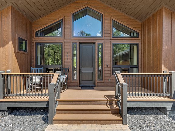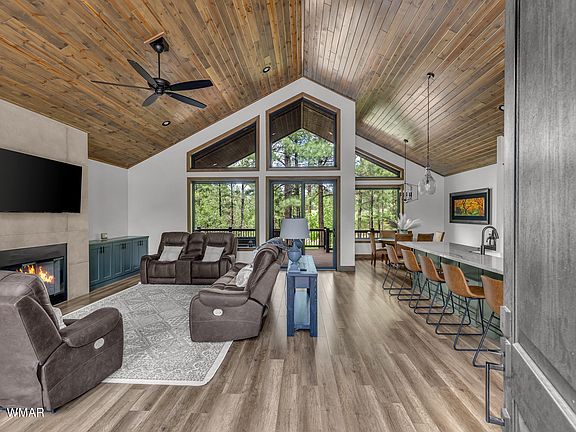 Welcome to 181 S Silk Tassel Rd, a stunning 3-bedroom, 2-bath home situated in the prestigious Torreon community of Show Low, Arizona. As you approach the home, you're greeted by a private drive that majestically winds its way through towering pine trees, leading to a residence that perfectly embodies both rustic charm and modern elegance. The exterior, adorned with wood siding, effortlessly blends with its natural surroundings. Once inside, you'll find a generous 2,065 sqft of meticulously designed living space that captivates with large glass windows, flooding the interiors with an abundance of natural light. The living room serves as the heart of the home, boasting a large fireplace that offers a cozy respite for chilly evenings. Adjacent to the living area is a state-of-the-art kitchen, equipped with stainless steel appliances and a gas cooktop stove. A wine fridge adds a touch of luxury and convenience for the wine enthusiast. The dining room is strategically positioned to overlook the oversized deck, making meals a scenic experience.