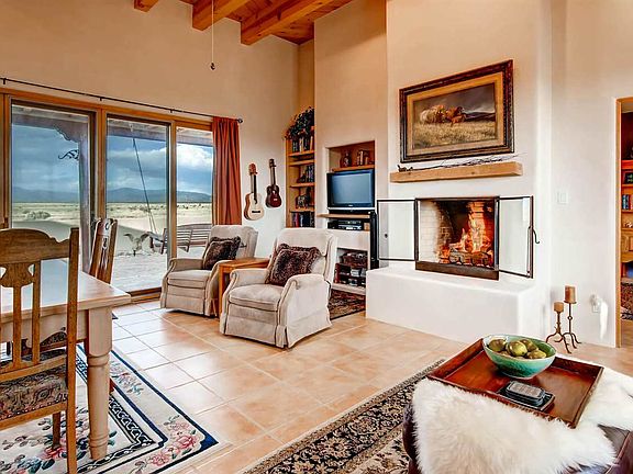 This custom-built home is located on 13 acres in a gated, horse-friendly community with paved roads. Enjoy wide-open spaces, riding trails and arena, dark starry nights, and plenty of privacy. The main house features two en-suite bedrooms and a powder room. A spacious kitchen opens up to a large great room with high beamed ceilings. Two gas log fireplaces in the main house, both with hand-crafted wrought iron doors, are among the special touches featured in this enchanting home. Panoramic views of the Sangre de Cristo, Jemez, Sandia and Ortiz mountains surround the property by day and a necklace of city lights shimmer by night. The guest house boasts a large living area with a gas log stove, a cozy separate bedroom, and a roomy 3/4 bath. The attached studio has heating, cooling, storage, a 220v outlet, enough room for two cars, an oversized garage door, and a pedestrian door.