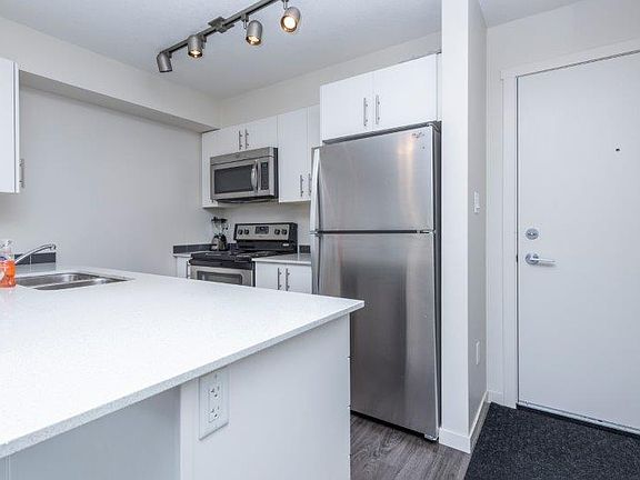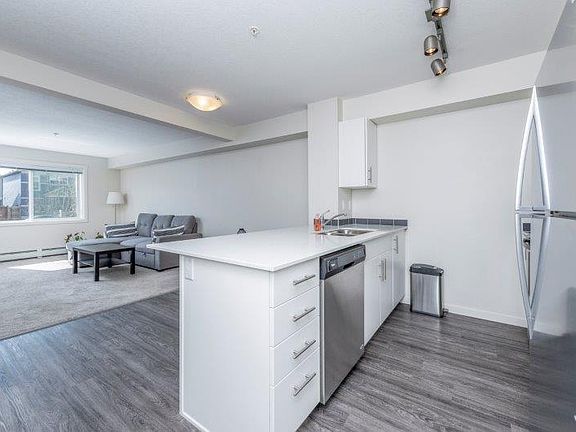 This modern 1-bedroom condo can be found in the family-friendly neighbourhood of Skyview Ranch. The Skyview Ranch Manor building is perfectly located within this community to provide easy access to local shopping, schools, parks and playgrounds and access to main roads like Metis and Stoney Trail. The Skyview Ranch Manor building has a variety of amenities such a very modern and well-appointed party/lounge room, elevators, security cameras and on-site community leaders. The front entryway of the home is a fair size with a nearby closet that has extra shoe storage to help prevent clutter at the front door. The light grey flooring flows from the entrance, thru the kitchen and dining areas and meets a carpeted living room with a tremendous amount of natural light, compliments of 2 giant bay windows. Kitchen highlights include light-coloured quartz counters with an eat-up bar, S/S appliances, contemporary cabinets & cupboards and a tiled backsplash in a complementary colour palette finishes the space. The contemporary style continues into the bedroom as does the amount of natural light from yet another oversized window and enough floor space for a king-size bed set. A large double-sided closet will meet the storage needs of any demanding wardrobe. A 3pcs bathroom, in-suite laundry with full-sized washer and dryer, and one underground parking stall complete the unit. Length of lease is negotiable, but the advertised rate is the best-offered rate and is based on a 12-month fixed lease. Pets negotiable Heat and water included