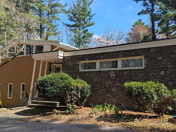 Welcome to your private oasis in Attleboro! This unique 5-bed, 3.5-bath split-level contemporary blends retro charm with modern function. The main level features a spacious primary suite with full bath and private office. The eat-in kitchen with fireplace and ample counter space flows into a stunning great room with hardwood floors, a bright dining area, and a step-down living room with tons of natural sunlight and cathedral ceilings. Upstairs offers a cozy library landing connecting 4 generous bedrooms, and a full bath. The lower level includes a fireplaced family room, second kitchen, and half bath—perfect for guests or entertaining. The basement has a full bath, large laundry room, game room with pool table, bonus room ideal for a gym or studio, and abundant storage. Enjoy the outdoor atrium with fountain and garden space. The private, wooded backyard features a tree house, oversized shed, and plenty of space to relax, play, or create—this hidden gem is truly one of a kind!