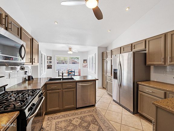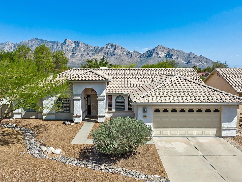 Gorgeous 3BD/2BA (1,886 sq ft) home in the heart of Oro Valley boasts formal & informal living, split bedroom plan, 2 full baths, vaulted ceilings, wood shutters & arches, plus large, diagonal set tile and wood flooring throughout. Energy efficient solar on home. Chef's kitchen showcases beautiful glazed concrete countertops, stainless appliances, dining nook, plus adjacent Family Room with woodburning fireplace. Master suite with patio access hosts a luxury bath with dual sink vanity, soaking tub, walk-in shower & closet. Bedroom 2 has walk-in closet. Bedroom 3 with closet built-ins can double as an office. Built-in storage cabinets and workbench in garage. Lovely rear covered patio features brick pavers and sunshades. Enjoy the sparkling pool, extended pavers and peeks of the Catalinas.