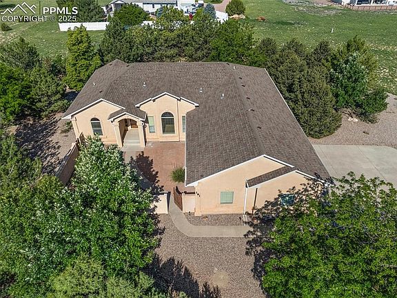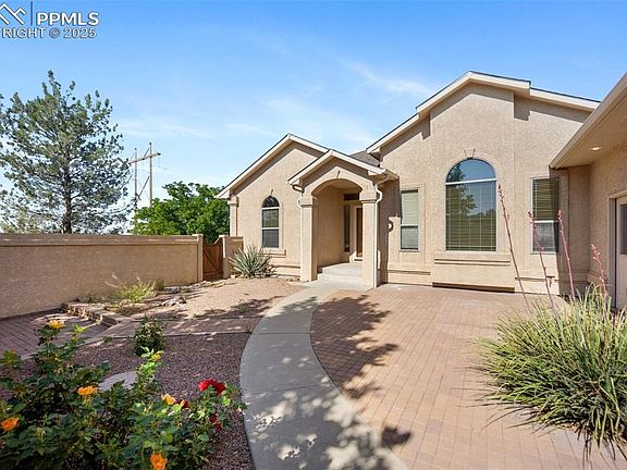 Charming ranch-style home in Liberty Point, set on a beautiful acre of land. The lovely courtyard creates an inviting entrance. This home shows pride of ownership, with features like a formal dining room and a spacious primary suite, complete with a walk-in closet and a 5-piece bathroom that includes a garden tub and walk-in shower. The kitchen boasts stainless steel appliances, ample cabinet and counter space, a pantry, and a cozy nook with views of the lake. The split-bedroom design includes two additional bedrooms and a full bath. Natural light fills the home, and the family room and kitchen flow together perfectly for entertaining. The garden-level basement also brings in plenty of light. Enjoy the expansive deck with views of the Pueblo Reservoir and the mountain range. Mature landscaping enhances both the front and back yards.