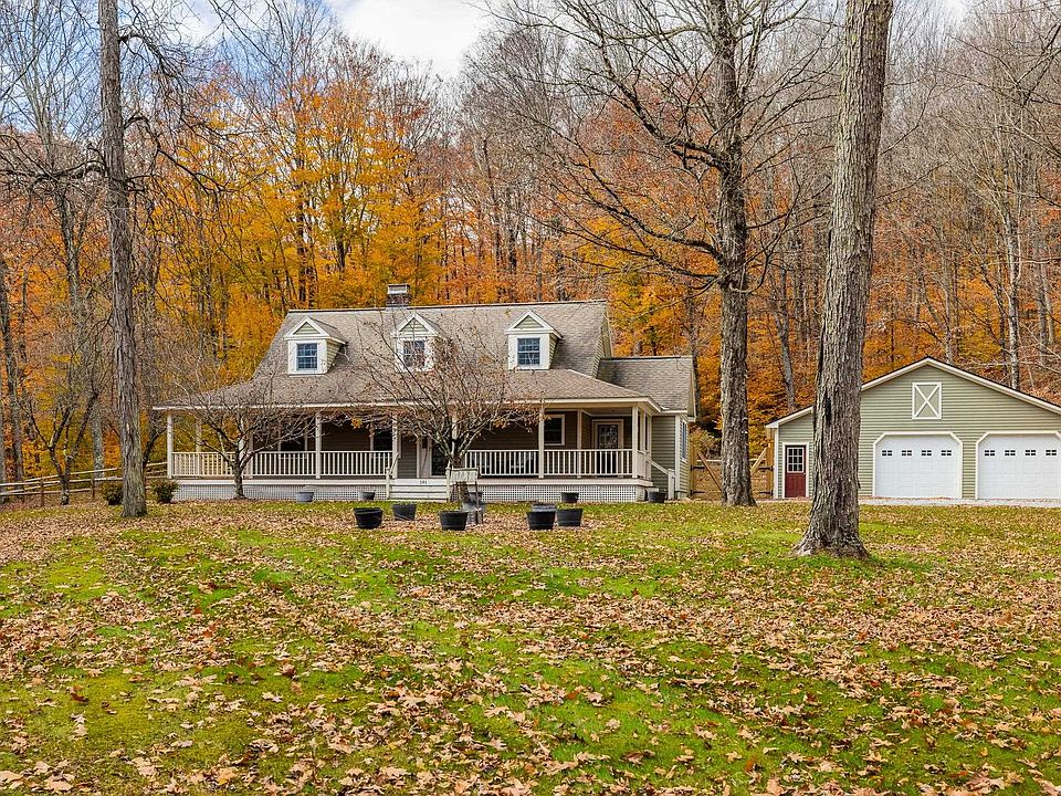 Tucked into the foothill of the green mountains you will find this well constructed 3 bedroom 2 bath cape style home with oversized 2 car garage on 2.19 acres. This comfortable home features an updated kitchen with new island, updated appliances 6 burner gas range and classic tile back splash. The living room offers a beautiful soap stone wood burning stove and a new mini split for AC and heat. All windows and door are in excellent condition and sliders that our to the fenced in back yard. The first floor also features a full bathroom, laundry, pantry and office/ mudroom space. The second features three generous sized bedrooms and a three-quarter bath. The lower level is partially finished with a Rec room for a full sized pool table and a gym area. There is a also a spacious workshop, boiler room and extra storage with a door right out to the back yard. Very well thought out. Everything about the house is well done, from expansive covered front porch with mountain views, the large backyard with canopy covered sitting area to the new garage. All this in the Arlington Area. 10 minutes to Manchester and 15 minutes to Bennington. Priced to sell! Call today for a showing.