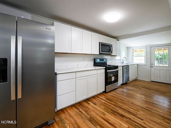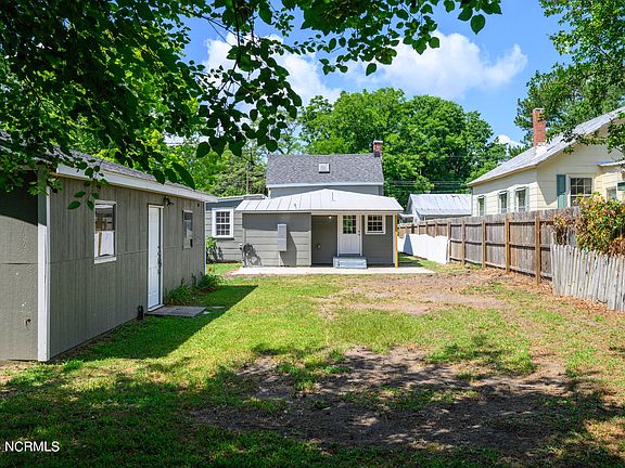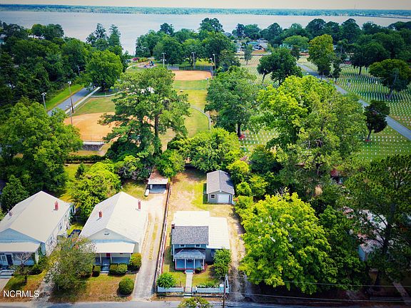 Welcome to your dream home, perfectly located in Flood Zone X where flood insurance is not required! This completely remodeled gem offers modern amenities and classic charm, backing up to serene baseball fields and the historic New Bern National Cemetery. Enjoy peace of mind with all-new infrastructure, including a 2024 roof, HVAC, plumbing, electrical systems, and a tankless water heater. The charming rocking chair front porch is perfect for relaxing and enjoying the neighborhood. Enter inside to a spacious living room with beautifully refinished hardwood flooring that leads to a formal dining room, ideal for hosting dinners and special occasions. The updated kitchen features stunning quartz countertops, new cabinetry, and stainless steel appliances. The primary bedroom includes an en suite bath with a walk-in shower for a spa-like experience. There is a second bedroom downstairs and a third bedroom upstairs, providing versatile living options. The backyard offers views extending to the Neuse River. With a great location offering convenient access to everything New Bern has to offer, this adorable home also includes a large 28' x 17' detached garage with electricity, perfect for storage or a workshop. Find MCAS Cherry Point in Havelock and North Carolina's Crystal Coast beaches only a quick commute away. Don't miss the opportunity to make this house your home! Contact us today for your private showing!
