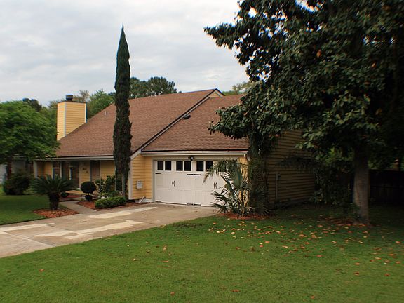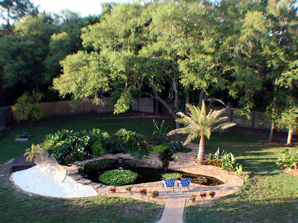 Tropical Oasis about a mile from the Ocean with a third-acre Lot & Pond nestled under oak trees & backs up to a turtle preserve. Striking 2-story home offers almost 1900 SF of living area with an open airy Living & Dining Room, vaulted ceiling & wood burning Fireplace. Eat-in Kitchen has decorative countertop bar with copper & granite countertops & lots of cabinets. Spacious Master Suite is on 1st floor with a new updated Master Bath. Second floor features a Balcony overlooking downstairs with 2nd Bedroom with full updated Bath & large Loft area with 3rd Bedroom, Game Room or Office & 3rd full Bath. A wall was removed from 3rd & 4th Bedrooms to create Loft area. Backyard has an open Porch with Tiki Hut, paver patio & walkway to Pond. Attached 2-car Garage, Water Softener, Security System.