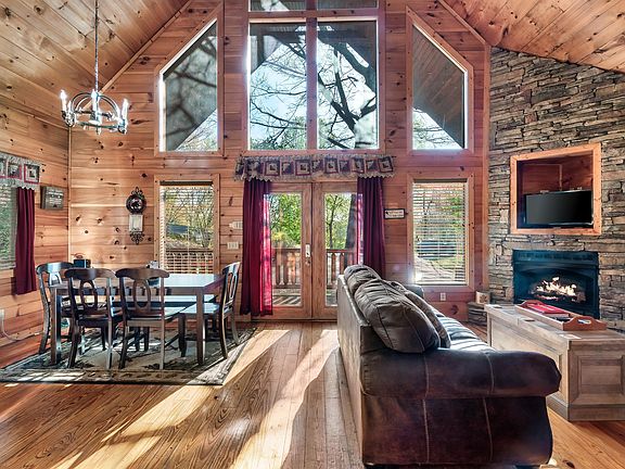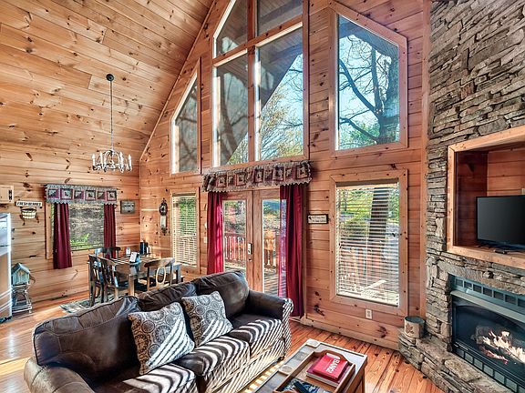 Great investment opportunity in the heart of the Smoky Mountains! This turn-key short-term rental is located just 15 minutes from all the attractions of Pigeon Forge, ensuring maximum appeal to vacationers seeking convenience and adventure. The gas stack stone fireplace and wall of windows create a cozy ambiance that guests will love, while the log staircase adds a touch of rustic elegance. With stainless appliances in the kitchen, a master suite on the main level, and accommodations for up to 8 guests across 2 bedrooms and 2 bathrooms, this cabin is perfectly poised for high occupancy rates and excellent returns. Luxurious features such as vaulted ceilings and a jacuzzi tub with a waterfall feature will attract discerning renters seeking a premium experience. Complete with a hot tub for ultimate relaxation, this investment property promises both enjoyment and profitability in the thriving short-term rental market of the Smokies.