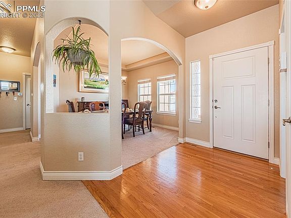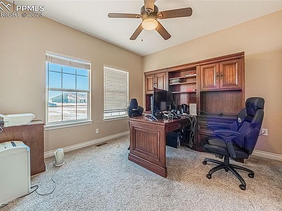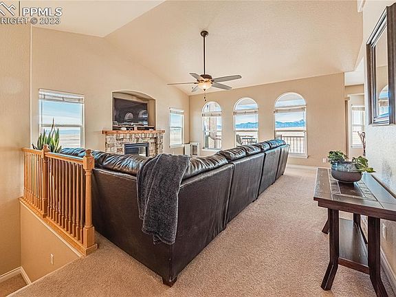 Incredible Pikes Peak and Sangre de Christo Mountain views from just about every room of this beautiful rancher located on nearly 4 acres. In the mornings take in the majestic beauty that is America's Mountain from your covered elevated deck, or from the comfort of your family room and the warmth the gas fireplace provides. In the evenings, the Pikes Peak Sunsets will surely captivate you and your guests who won't get enough of the natural beauty Colorado provides. The main level features the formal dining room, front facing office, expansive family room, gourmet kitchen, breakfast nook, large master suite with jetted tub, and of course, the walk out covered deck. The basement is where you will find 3 additional bedrooms, one which is attached to the full bathroom, the theater room, and an inviting wet bar. The basement walks out to the concrete patio where you will find the perfect space for a hot tub that's protected by the upper level deck. The Level IV Roof was installed in 2020 and comes with a limited lifetime warranty. The home is equipped with a Starlink Broadband internet system, so if you happen to work from home, you won't have to trade internet speed for country living. The home also has a water softener, whole-house water filtration system, and the well pump was replaced in late 2022. A portion of the land is fenced to keep your four-legged friends close. The large chicken coop allows for plenty of hens to provide enough eggs for you and your friends. Home is located minutes from Schriever Air Force Base, and shopping.