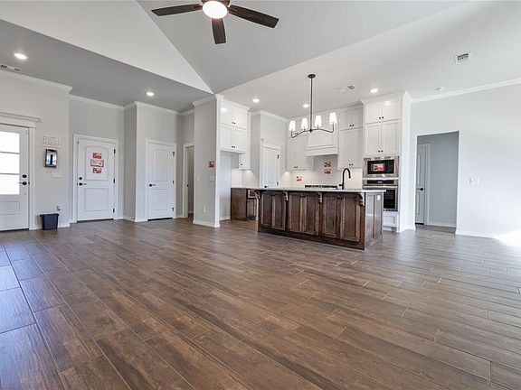 This Hummingbird floor plan features 2,025 Sqft of total living space, which includes 1,800 Sqft of indoor space & 225 Sqft of outdoor living. There is a 565 Sqft, three car garage with a storm shelter installed. This home offers 4 bedrooms, 2 bathrooms, 2 covered patios, & a large utility room. The great room welcomes a breathtaking cathedral ceiling, a gas fireplace with our stacked stone surround detailing, large windows, wood-look tile. The high-end kitchen has 3 CM countertops, custom-built cabinets to the ceiling, stainless steel appliances, vogue tile backsplash, stellar pendant lighting, a corner walk-in pantry, & a large center island that holds a sink & dishwasher. The elegant primary suite has a sloped ceiling detail with a ceiling fan, windows, and our cozy carpet finish. The attached spa-like bath includes a dual sink vanity, TWO spacious walk-in closets, a roomy walk-in shower, & a Jetta Whirlpool tub. The covered back patio offers a wood burning fireplace, a TV hookup, & a gas line for your grill. Other amenities include Healthy Home Technology, a fresh air ventilation system, a tankless water heater, R-44 insulation, & more!