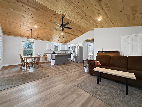 Tucked away among mature, towering trees, this 2-bedroom, 1-bath home offers the perfect blend of rustic charm and modern comfort. The inviting great room boasts an open-concept design with a vaulted ceiling, beautifully finished in pine tongue-and-groove, creating a warm and welcoming atmosphere. Large windows bring the beauty of the outdoors inside, while the surrounding 5 acres provide privacy, peace, and plenty of space to explore. Located in the heart of Lake Country, you’re never far from world-class fishing, boating, and year-round outdoor recreation. Whether you’re seeking a weekend getaway, a seasonal retreat, or a full-time residence, this property delivers the best of northern living. The property offers two RV hookup sites, one is a 30-amp service and the other is a 50-amp service, with water hookup.