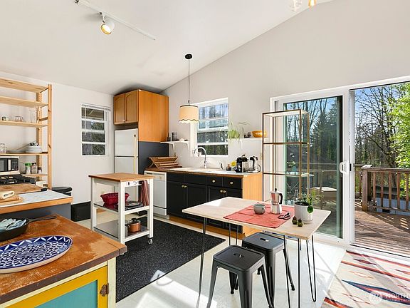 Bring your vision to this sun-filled open floorplan with vaulted ceiling. Rear deck overlooking large, grassy backyard with 300sf wired storage building backing onto a green belt. Primary bedroom, full bathroom, and laundry room w/ all-in-one washer/dryer on the main level. Two bedrooms downstairs, one used as owner's storage space also has W/D hookup. Downstairs 1-bedroom/bath/den has been leased as a profitable AirBNB making $18K last year with minimal effort. Ideal for multi-generational living, guests, or profitable rental. Energy-efficient vinyl windows, new roof Feb. 2024. Huge lot with high-end new homes being built across the street. Quiet residential street, friendly neighbors, near top-rated Northshore schools and amenities.