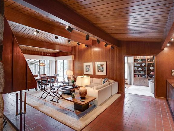 Stunning Mid-Century Modern masterpiece designed by architects Cording & Mastney in 1959. Beautiful setting at the end of a cul de sac on nearly a full wooded acre with private views year round. Warm and inviting one-level living with elegant natural materials including solid cherry walls, 3" thick solid cedar tongue-in-groove ceilings, natural stone and copper fireplace. Flowing spaces perfect for entertaining inside, in the screened porch and on the spacious deck with relaxing koi pond. A custom kitchen that is a joy to work in, with both a skylight and a view. 5 bedrooms, 4 bathrooms, 3 fireplaces. This exceptional one-of-a-kind home is a must see, available for the first time in 41 years.