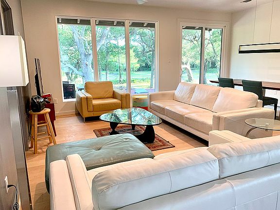 Live in your own oak forest. This 19.83 acre property has too many oak trees to count. You can have a park and wilderness all in one piece of land. You are 2 miles to the new Austin Point development, but, completely screened from everything if you want. You have abundant wildlife and a huge variety of birds that visit the pond. The 10x30 ft Trex deck lets you sit and relax. The house was moved from Houston in 2021 and was completely stripped to the studs and rebuilt. All new electrical, heating, cooling, plumbing, roof, septic tank and maple hardwood floors and Pella windows were installed. The ceiling was raised to nine feet. The windows are huge, especially in the living room and bedroom. All appliances stay with the house. A dream home could be built at the rear of the property with amazing views. The main section of the property has never flooded and is not in the flood plain. The steel 24x30 barn and 20x24 garage are recent. The Kubota L 2800 tractor and various tools go with the property. The house is all electric and uses well water.