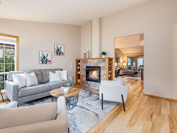 When you enter into this charming single story home, you are greeted to a cozy living room with gas fireplace, vaulted ceilings, beautiful hickory engineered hardwood floors, open concept kitchen and family room. The inviting kitchen provides Corian counter tops, upgraded varnished cabinets and newer appliances. The sliding glass door opens to the sunroom where you can enjoy your morning coffee watching the birds in your beautifully backyard with raised garden beds and paver pathway. In addition to this lovely yard there is a custom-built dog kennel and two storage sheds. Your own private gate takes you to the adjoining greenspace overlooking the Tualatin River. This home features the owners suite with large windows overlooking the private yard, vaulted ceilings, en suite and large closet. Two additional bedrooms and a bathroom compliment this home which is perfectly packaged under a newer roof. The large driveway provides parking for trailer, small RV or boat. Near many amenities and easy commute!