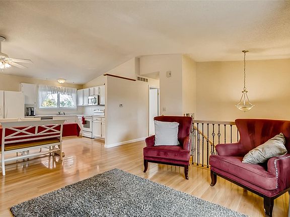 Bright open floor plan home features living space upstairs and downstairs! Enjoy the spacious vaulted living room featuring wood-burning fireplace. Sunny eat-in kitchen opens to a large deck overlooking your fenced yard with no neighbors behind you! Wood-burning fireplace. Two spacious bedrooms and a full bath with pass-through to master upstairs. Downstairs find a large family room, two additional bedrooms, bathroom and storage. Exterior is no-maintenance brick and vinyl siding, windows were already replaced. Enjoy the big, private corner lot with mature trees, lilacs and hydrangeas on a quiet cul-de-sac in a great neighborhood. Beautiful sunsets from your back deck. Walk to Trails West Elementary School, near bus stop for Falcon Creek Middle and Grandview High School. HOA is only $62 a YEAR with Pool and Tennis Courts. Welcome home!