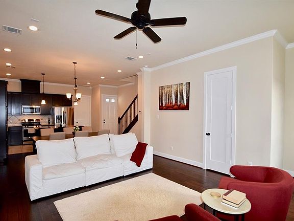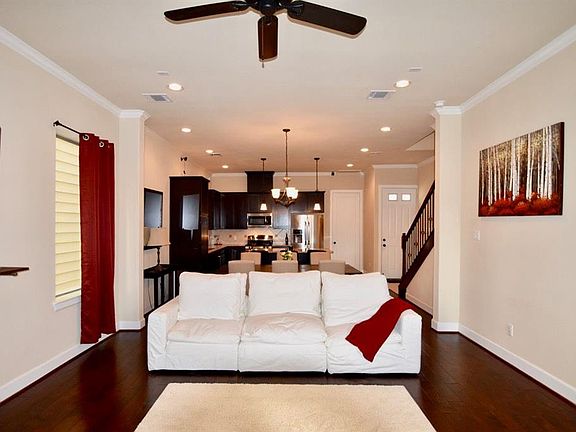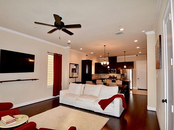 Welcome to your urban oasis! This stunning three-story home, nestled in the heart of the city, offers 4 spacious bedrooms and 3.5 elegant bathrooms, perfect for modern living. From the moment you step inside, you'll be captivated by the open-concept design, hardwood floors, and abundant natural light that highlights sophisticated features. The main floor boasts a generous living area with high ceilings and expansive windows that frame breathtaking downtown views. The gourmet kitchen is functional and sleek, stainless-steel appliances, granite countertops, and a large island ideal for entertaining. Adjacent to the kitchen, the dining area flows seamlessly into a cozy living room featuring a thoughtfully designed built-in desk nook. On the second level, you'll find the luxurious master suite, a true retreat with its own private balcony. The en-suite bathroom is a spa-like haven, complete with a soaking tub, separate shower, and dual vanities. The second bedroom offers ample space, walk-in closet and a full bathroom ensures convenience for family and guests. The third floor features a game room and versatile bonus room that can serve as a home office, media room, or play area, along with a fourth bedroom, walk-in closet, and full bathroom. Step outside to your private rooftop terrace on either of the two balconies, where you can unwind and enjoy panoramic downtown views against the backdrop of vibrant city lights. With customized interiors, multiple outdoor living spaces, and direct access to nearby amenities, this home is designed for both relaxation and entertainment. A mile from Minute Maid Park, experience the best of urban living in this exceptional property, where luxury meets convenience. Don't miss the opportunity to call this downtown gem your new home! Renter responsible for utilities (Water, electric, gas). First month rent + security deposit due at signing. No smoking allowed. Dogs welcome.