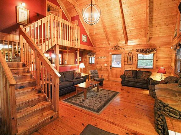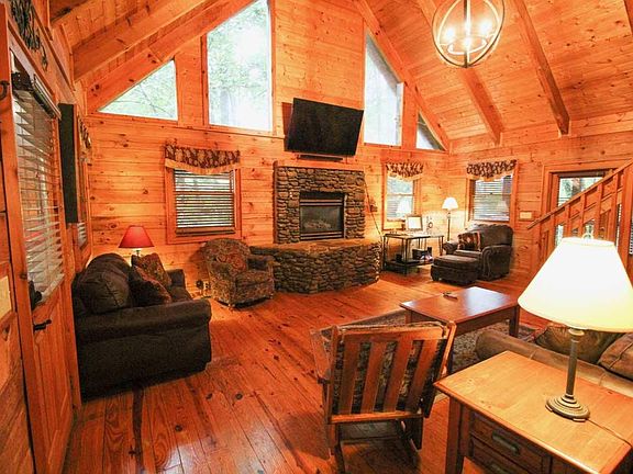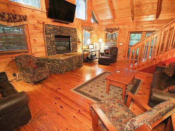 2 bedroom, with bonus room, 3 bath cabin nestled perfectly between Gatlinburg and Pigeon Forge. This Smoky Mountain getaway features beautiful hardwood floors and a large stone fireplace with gas logs. Going upstairs to the master bedroom you find a tasteful whirlpool tub situated next to a cozy second gas log fireplace. The tile shower and decorative sink complete the master bathroom. Downstairs you have 2 bedrooms with a full bathroom at the end of the hall. With a pool table, darts, and a hot tub on the adjacent screened in porch it makes this cabin in the woods the perfect hang out!