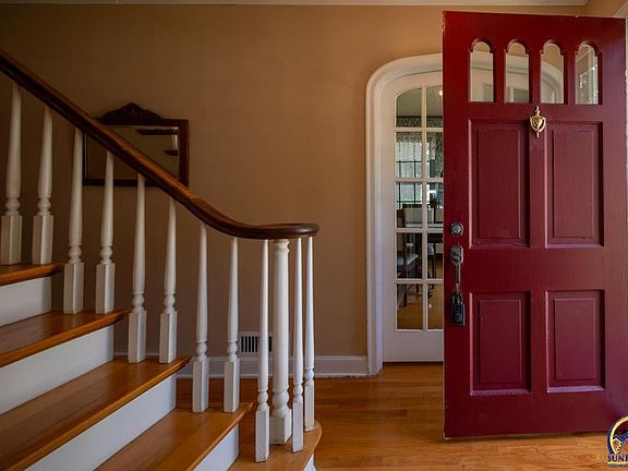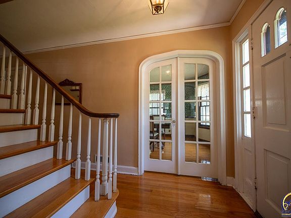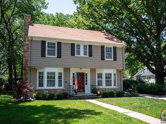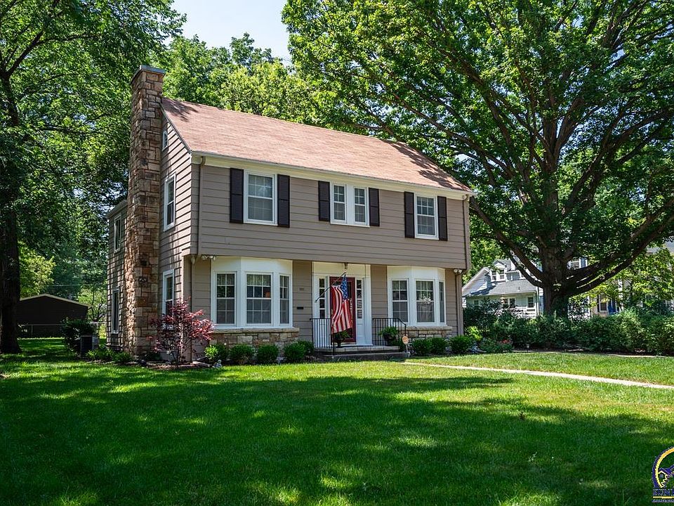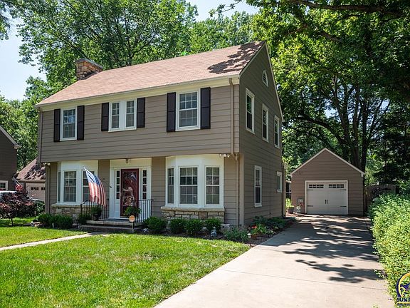 This classic center hall Colonial will charm you with its character! This lovely home is an L.F. Garlinghouse design; there is only one other example in Shawnee County. Greeted by its green landscape and pretty plantings; it has a striking curb appeal! Entry way showcases French doors to the formal dining room and a fancy railing with wood stairs leading to the second floor. Large living room with a fireplace, built-ins, and lovely natural light. Additional living room space in the adjacent first floor family room. Formal dining room with a swinging door to the kitchen plus a "breakfast room." Main floor guest bath is quaint with pedestal sink. Noted throughout the home are fancy light fixtures, glass door knobs, and crown moldings. Second floor features a spacious primary bedroom, full bath, and 2 additional bedrooms. Listing shows 1 car garage but garage was built to host 2 cars, in tandem- one in front of the other. Backyard nicely landscaped with a patio to enjoy the outdoor space. Come see and enjoy!