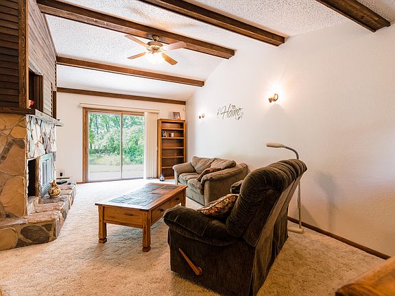 Ranch style home with a 40' x 74' shop situated on a beautiful 2.2 acres surrounded by mature trees. This 2,876 sq ft slab on grade home has 3 bedrooms which includes the master suite with a 3/4 bathroom. The kitchen dining room area lets in an abundance of natural light leading to the living room. The home also has two family rooms, one has a wood burning fireplace with a sliding glass door to the backyard and the other family room is large with newer carpet and a wet bar. Additionally there is an office area, laundry, and 1/2 bath. Attached is a 3-stall heated garage with a floor drain, hot and cold water, and a loft for storage. The 40' x 75' shop is insulated and has 4 garage doors for easy access, a large loft for storage, 220 outlet, and extra living quarters. The living quarters has 2 bedrooms, 3/4 bathroom, living room, kitchen area, and 1/2 bathroom. Also included on the property are 2 wells, rural water membership, and 2 1,000 gallon propane tanks. Call an agent to schedule a private showing.
