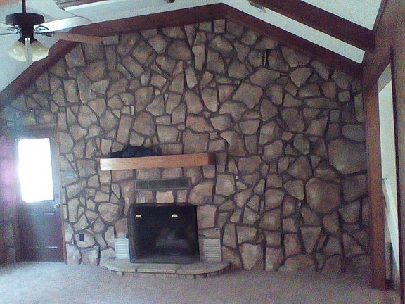 Neat 3/2 with neutral colors, stone fireplace, utility closet convenient to bedrooms, pretty stained glass in foyer, walk in closet and shoe rack in two bedrooms, great front and back porches, double garage, almost 2 acres of land, NICE!