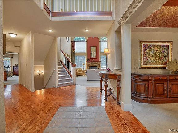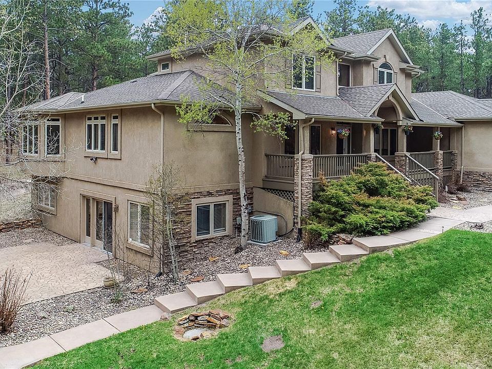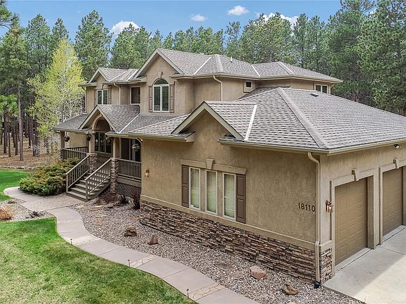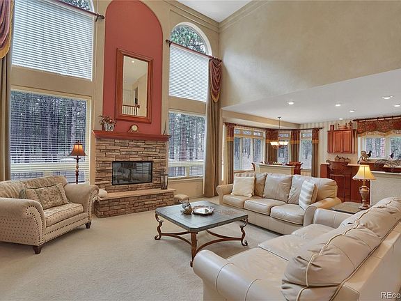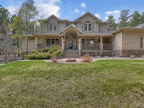 Stunning Home inside and out nestled in the trees at Kings Deer. Covered front porch will greet you as you walk up to the home. Enjoy main level living with a WOW factor! Dramatic 18' Ceiling with stunning Chandelier. Perfect for entertaining or enjoying solitude with impressive living room with wood burning fireplace. Gourmet kitchen with island / breakfast bar, built in work stations, Subzero refrigerator, and double oven and gas range, pantry. Adjacent breakfast nook walks out back to the rear deck perfect for BBQ, Additional formal dining room and main level office. Master suite is large and well designed. Upstairs Bed 2 has an en suite ¾ Bath, additional 2 bedrooms and another full bath, In the Basement there is another bedroom with en suite bath, Spacious Family room with 9' Ceilings and walk out to stamped concrete patio. Additional large room that is perfect for theater or a home gym and lots of storage. Looking for privacy in the trees. 2.5 Acres great location and close proximity to 1-25 or 83 for going North or South