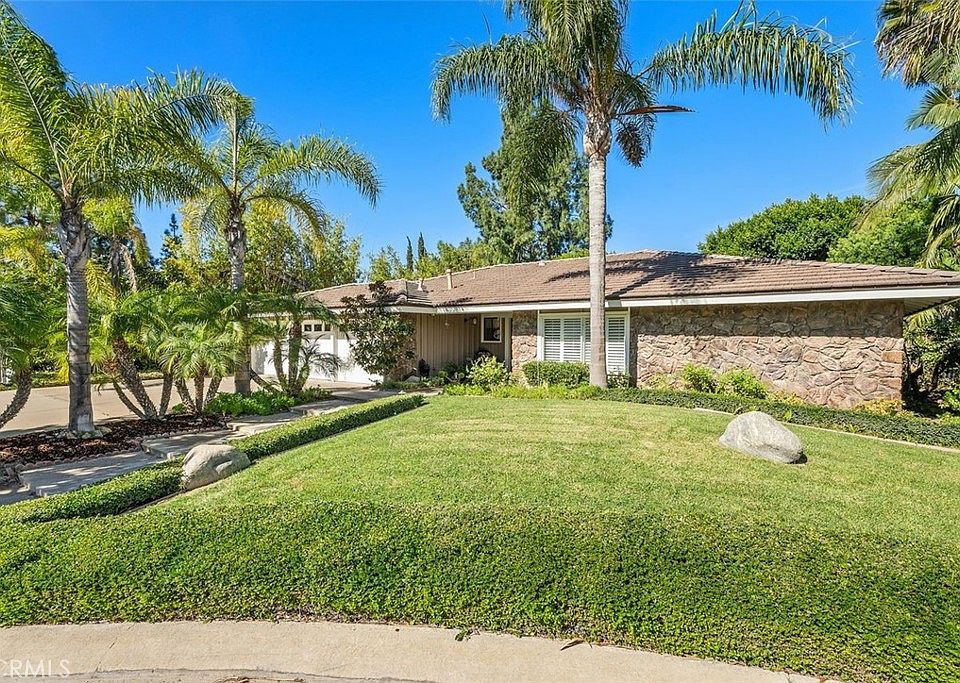Tucked away in the Hidden Jewel of Orange County is this incredible single-level home situated on a quiet cul-de-sac. This 4-bedroom, 2-bathroom home offers 2,304 square feet of comfortable living space on a spacious 11,200 square foot lot, where a serene and tranquil park-like backyard awaits. Upon entering, the formal living room welcomes you with vaulted ceilings and a cozy stone fireplace, creating a warm and inviting atmosphere. This space seamlessly opens up to the dining area, which boasts fantastic views of the peaceful backyard, making it the perfect spot for gatherings and meals. The kitchen is a delightful culinary haven, featuring granite counters, oak cabinets, a double oven, hardwood floors, and a bay window that overlooks the backyard patio. The informal dining area is open to the kitchen and the family room, which features another stone fireplace, providing a comfortable space for relaxation and entertainment. Down the hallway, the spacious master bedroom offers a peaceful retreat with an ensuite bathroom with a large vanity area and a mirrored closet. The privacy toilet and walk-in shower with a glass enclosure is just beyond the bathroom door. The remaining three bedrooms are generously sized and share a well-appointed hallway bathroom with a shower-in-tub combination, complete with a glass door enclosure. Step outside to your personal sanctuary with a beautiful patio, built-in BBQ area, and lush green grass accented by charming steppingstones. The manicured lawn is surrounded by dense foliage and abundant shrubbery, adding an extra layer of privacy. The home is equipped with an attached 3-car garage, dual pane windows and plantation shutters, adding to the overall sense of comfort and style. Conveniently located in a great neighborhood close to 55/22 fwys, great shopping, restaurants and entertainment. Don't miss the opportunity to make this single-level home your own, and experience the charm that Villa Park has to offer.