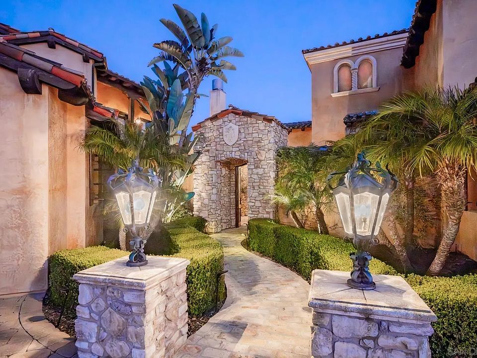 A true showpiece in Rancho Santa Fe’s exclusive Cielo community, this architectural estate sits privately perched above it all, capturing uninterrupted panoramic views that stretch from rolling hills to the Pacific Ocean. Designed by acclaimed architect Dena Gillespie, known for crafting homes with mystique and presence, this 4+ bedroom villa is a masterclass in timeless design, blending reclaimed European elements with refined craftsmanship and modern sophistication. The front courtyard, anchored by a custom Vietri fountain and grand stone staircase, sets a cinematic tone that continues throughout the home’s dramatic interiors and seamless indoor-outdoor flow. The backyard has a patio with fire pit, private guest quarters, solar power, and a spa elevate the lifestyle offering, while the unique lot shape creates over 220 feet of backyard frontage with space for a resort-style infinity pool and a one-acre hillside ready for a vineyard. Every detail of this estate has been curated to deliver character, elegance, and star-level appeal in one of Rancho Santa Fe’s most prestigious settings. Cielo offers an exceptional lifestyle centered around the Cielo Club, an 8,000 sq. ft. facility featuring elegant event lounges, a catering kitchen, meeting rooms, a modern fitness center, and spa amenities. Outdoors, residents can enjoy a competition-sized pool, a children’s wading pool, a shaded pavilion with gas grills, tennis courts, and a playground. The Montagna Club adds even more with its own pool area, open-air pavilion, outdoor fireplace, and tennis courts. Spanning 1.5 acres, Cielo Park is a recreational haven with basketball and sand volleyball courts, a climbing wall, sports fields, and picnic areas with BBQs—perfect for active days and relaxed gatherings alike.