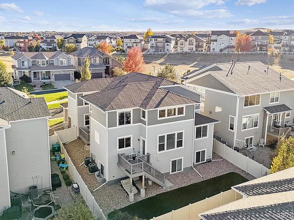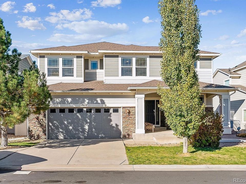 Nestled in a peaceful cul-de-sac across from a scenic community green space, this contemporary home showcases thoughtfully curated finishes and a spacious open-concept design. The inviting foyer is flanked by a home office, a formal dining room with an extra side patio, leading into a grand family room with soaring two-story ceilings, elegant hardwood floors, and a modern gas fireplace. The well-appointed kitchen is perfect for entertaining, featuring an oversized island, sleek 42” dark cabinetry, double ovens, granite countertops, and a built-in pantry. Step outside to the low-maintenance backyard, complete with a composite deck that can be expanded and a large turf yard, offering plenty of space to relax and entertain. The primary suite is a serene retreat, boasting tray ceilings, a generous walk-in closet, and a luxurious 5-piece ensuite bath with dual vanities and a walk-in shower. Upstairs, you’ll find two additional bedrooms, a full bath, a laundry room, and a spacious loft ideal for movie nights, a playroom, or a second office. The main floor also includes a guest bedroom with a ¾ bath for added convenience. This move-in ready home comes with dual furnaces and air conditioning, plus a 3-car tandem garage for ample storage. Ideally located just minutes from top-rated Douglas County schools, scenic trails, shopping, dining, parks, and major roadways, 18117 Dewhurst Lane is the perfect blend of modern living and everyday convenience. Schedule your showing today!