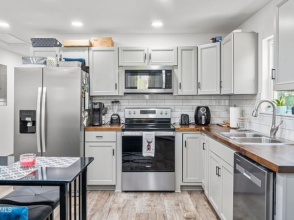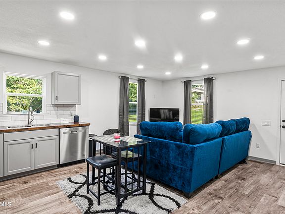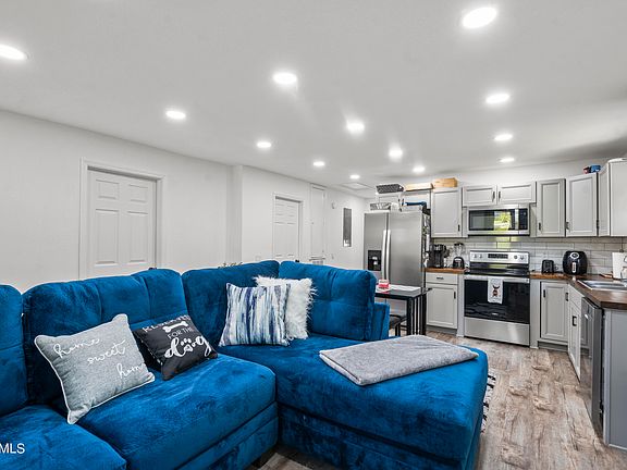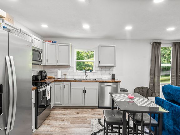 A covered front porch welcomes you as you enter your open living space with luxury vinyl flooring, new kitchen cabinetry, and stainless steel appliances. The recently installed window blinds provide additional privacy or shade.