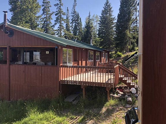 Beautiful views from large deck (shutters open for unobstructed views); 3 bed 1 bath, wall-to-wall brick fireplace in living room, wood stove on front deck and in large bunk room, powered by propane or generator, water from free-flowing spring. Adjacent lot included in price for a total of 1.4 acres. Enjoy 2-story storage shed with room for toys, generator, shed, & rustic outhouse.