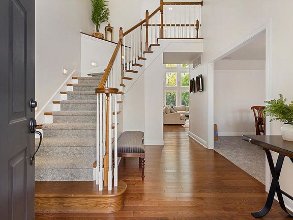 Welcome to this gorgeous 2 story home, perfectly situated in the desirable Trails at Brittany subdivision! This spacious house is adorned with newer hardwood floors, fresh carpet on the main level, and a second floor grand two-story foyer. A beautiful flex room is well positioned on your left as you enter that can be used as an office or bedroom, featuring built-in shelving and cabinetry. As you enter the right of the entry, you see the formal dining room. The kitchen is a chef's dream with an abundance of counter space and storage, a large custom island by Plum Grove Mills, and space for a table. The kitchen features quartz countertops, stunning Kitchenaid Architect Series Appliances, a gas stovetop which is vented to the outside, a large walk-in pantry with custom tile flooring & Elfa shelving, and hardwood floors. Off of the kitchen is a well-designed laundry room featuring custom tile flooring and custom cabinets by Plum Grove Mills. Cozy up to the fireplace that boosts a marble tile surround in the living room. Both the living and family rooms offer an abundant amount of light with tons of windows. The family room features custom painted, wood molding and stunning oversized ceiling fan. The powder room provides a professional design with a Custom Plum Grove Mills vanity, hardware, mirror, and fixture. The private first-floor master retreat includes an attached full bath and walk-in closet. Three additional bedrooms and two full baths complete the second floor. The zoned basement is wired for home theater & loaded with possibilities such as a game room and movie room. The basement includes a full bathroom has two staircases which provide access - one off of the garage which is somewhat unique and offers extra convenience after the weekly Costco trip! Enjoy the wrap-around rear deck which provide a full view of the vast yard and three-car garage providing an epoxy flake on the garage floor. New roof in 2021 and a black, aluminum fence installed in 2022. This home is a must see!