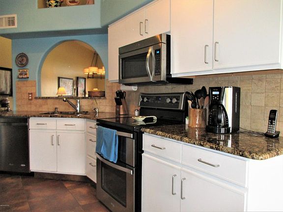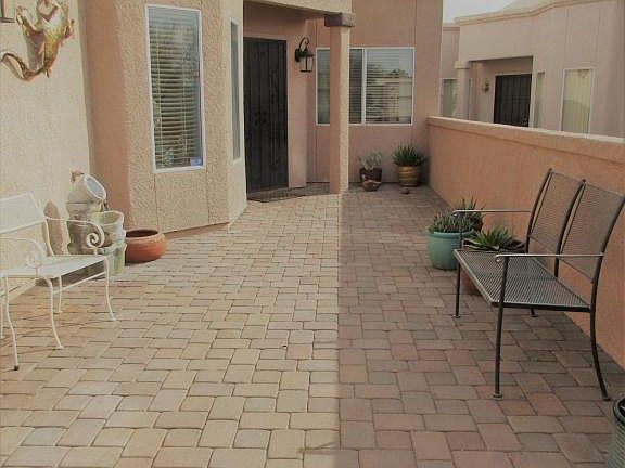 This is an amazing transformation of a Dorn home already blessed with high ceilings and loads of windows for a light-filled and open feeling. Just a few updates are a new heat pump, large tile, front courtyard, new granite, backsplash, faucets, lighting and stainless appliances for the kitchen, granite, cool sinks, faucets, lighting and mirrors for the bathrooms including a new shower door in the master, new fans throughout plus one on the back patio, addition of a water conditioner, solar tube and reverse osmosis system, new interior and exterior paint, new exterior lights, water feature, and even new window treatments and new brushed nickel door hinges and doorknobs for the entire house. Add a lovely view of the mountains from the front courtyard and the patio and you have it all.