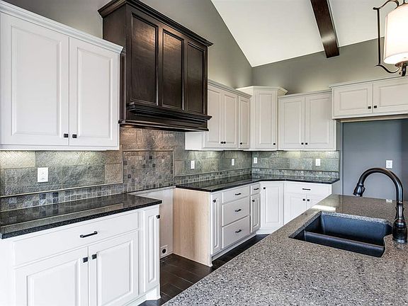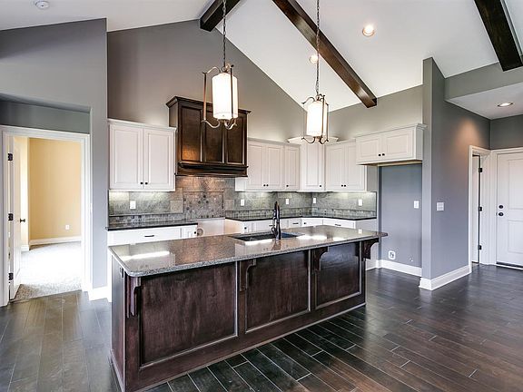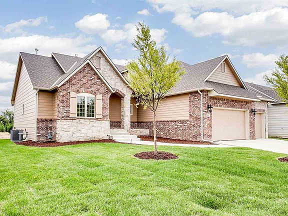 Modern elegance. This brand new and move in ready five bedroom home in Garden Walk features an attractive, unique exterior and a porch with swooping rooflines that lends architectural curb appeal. Rich and dark hardwood floors throughout the kitchen and living room. You'll find a full master suite with tile shower, split vanities, and access to the laundry room through the walk-in master closet. The guest main floor bedrooms feature a jack-and-jill bathroom setup with a tub/shower. Separate main floor half bath with custom built vanity and vessel sink. The basement is fully finished with a large family and game room, wet bar, and fireplace with custom built-in book shelves on either side. Exterior amenities include the covered deck with composite flooring, concrete patio at ground level (accessible from Walk Up/Out basement, and established lawn with sprinkler system and mulch beds. Energy efficiency upgrades: R38 attic insulation and R 22 blown blanket insulation for exterior walls. Garden Walk residents enjoy the best of both worlds by living in Wichita yet being in the acclaimed Andover school district. All figures, features, dimensions, tax information, and school information deemed reliable but not guaranteed. Contact listing agent for confirmation on all information. Builder and/or developer reserve the right to alter listing information at any time without prior notice.Developer and/or builder reserves the right to make changes in specifications, plans, terms, prices or builder programs without prior notice.