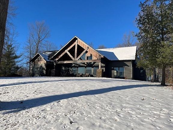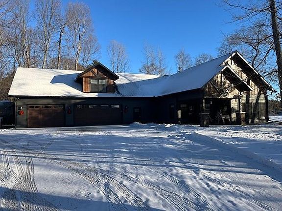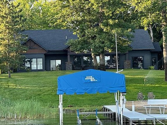 This beautifully designed, newly built home boasts numerous custom features, including striking rough-sawn ceilings and throughout the home, and a stunning staircase leading to a loft with breathtaking views of the lake. The main level showcases a four-season porch adorned with rough-sawn ceilings and shiplap walls with another entrance to the concrete stamped patio, a spacious foyer with a built-in bench, and a bedroom with walk-in closet that opens to a stamped concrete patio. while the kitchen impresses with its generous layout, large pantry, and an adjacent dining room and electric fireplace walking out to back concrete patio for grilling. The living room offers a vaulted rough-sawn ceiling, a cozy bar area with a wine mini refrigerator, and a walk-through space that includes a lake/dog or kid washroom, an additional refrigerator and sink , and access to the patio. The primary bedroom is a luxurious retreat with his-and-her closets, a walk-in tiled shower, a separate jetted, heated whirlpool tub, and double sinks with cabinet. A conveniently located main-floor laundry room with a pocket door completes the primary suite. Mudroom has custom bench and cabinets. Upstairs, the loft provides additional living space, accompanied by two expansive bedrooms, each with its own walk-in closet. The four-car garage is equipped with drains, heating, and a rear garage door for added convenience. The property offers a level lot, perfect for outdoor activities, and is close to the boat landing, ensuring privacy and easy lake access. Additionally, there is an option to purchase the adjoining property, which includes a charming guest cabin featuring four bedrooms and two bathrooms, 2 car detached garage and two sheds, 1.3 acres wooded, ideal for accommodating visitors or extended family.
