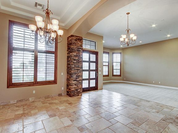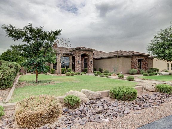Gorgeous Home with lush landscape, 3 car garage, RV Gate & Parking. Open floor plan. Dramatic wood beam ceilings, stone columns, plantation shutters, upgraded lighting & beautiful stone floor. Layered stone fireplace. Stunning gourmet kitchen features center stone island, granite countertops, SS double oven, built in refrigerator & upgraded staggered wood cabinetry. Great gathering place for family & friends. Grand master retreat with patio access, large walk-in closet, hammered copper soaking tub, fireplace, & a glass block snail walk-in shower. Upgraded fixtures throughout home. Peaceful & serene backyard boasts covered patio, grassy play area, refreshing pool, shade trees with an amazing built-in BBQ area w/fire! Pavers throughout front & back yard. Majestic Mountain Views! Call TODAY!